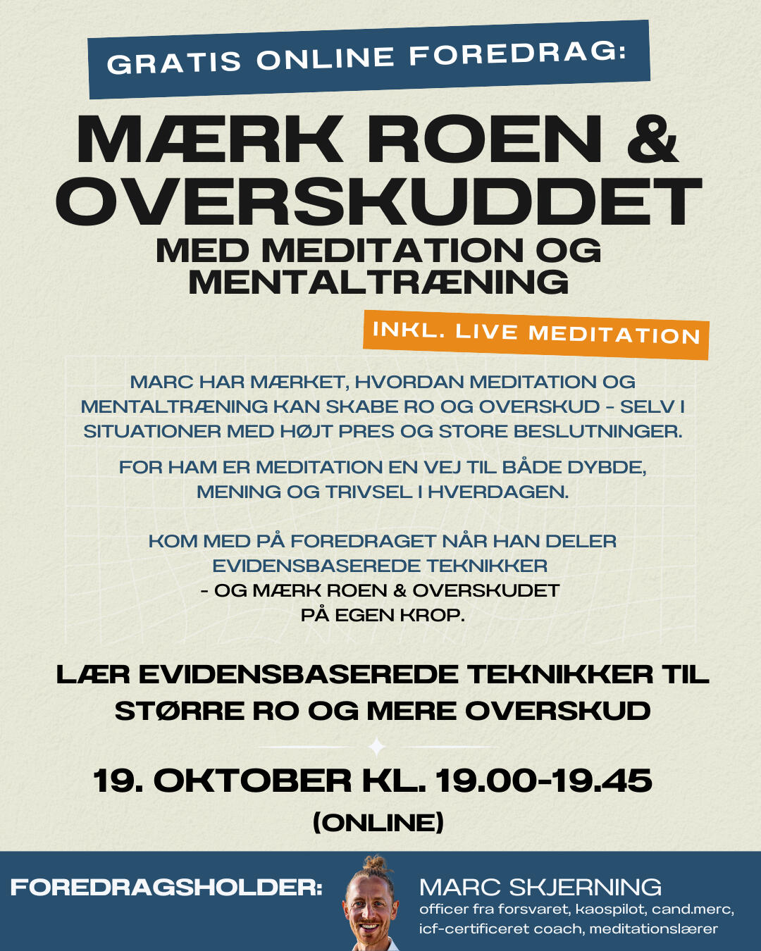 "Jeg kan huske da jeg skulle lære at meditere. Jeg havde studeret alle beviserne på for hvorfor det gav mening, men jeg syntes stadigvæk det var lidt mystisk. Der var ingen af mine venner der mediterede. Det føltes lidt som en undergrundsting, var svært tilgængeligt og kostede +4000 DKK.MEN jeg er så taknemmelig for at jeg tog springet. Meditation har ændret mig og mit liv.Og derfor har jeg lavet dette lille foredrag som en simpel og tryg introduktion til at meditere. Helt uden mystik og med simple øvelser som giver succesoplevelser fra start.Jeg håber på at se dig :-)